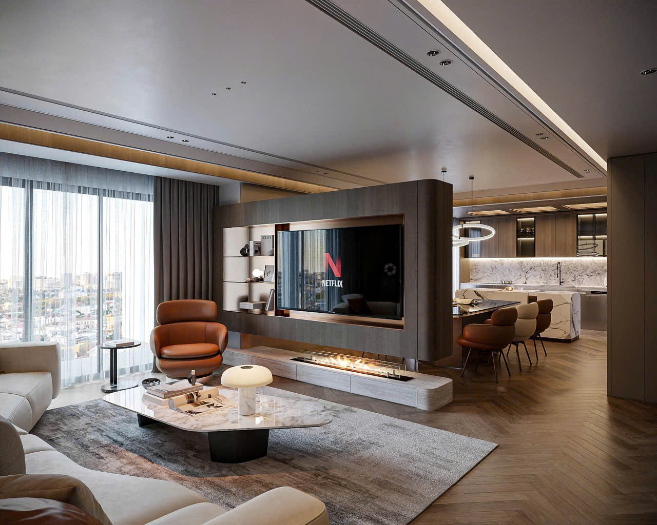 Tủ, kệ tivi: Thiết kế theo kích thước của khu vực tivi có thể kết hợp với hệ tủ chưa đồ cho phù hợp nếu không gian rộng