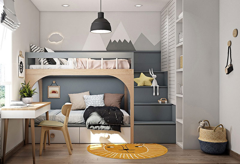Giường cho trẻ: Giường 1, giường đôi hoặc giường tầng. Kết hợp với ngăn đựng đồ dùng cá nhân để tạo không gian gọn gàng hơn ngăn nắp hơn, để đồ nhiều hơn. Hiện nay với những gia đình ở các căn hộ chung cư hay nhà phố 2 tầng thì sử dụng giường tầng cho trẻ được dùng nhiều nhất.