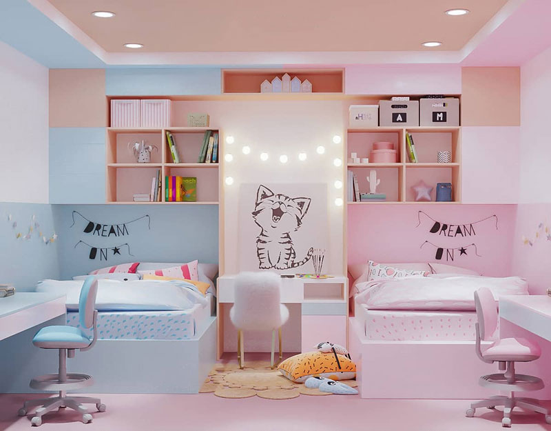 Màu sắc: Trong thiết kế nội thất phòng cho trẻ em thì màu sắc được quan tâm khá nhiều bởi vì màu sắc phải thể hiện được sự tươi trẻ, hồn nhiên nhưng phải đẹp. Phải có những điểm nhấn trong phòng của bé.